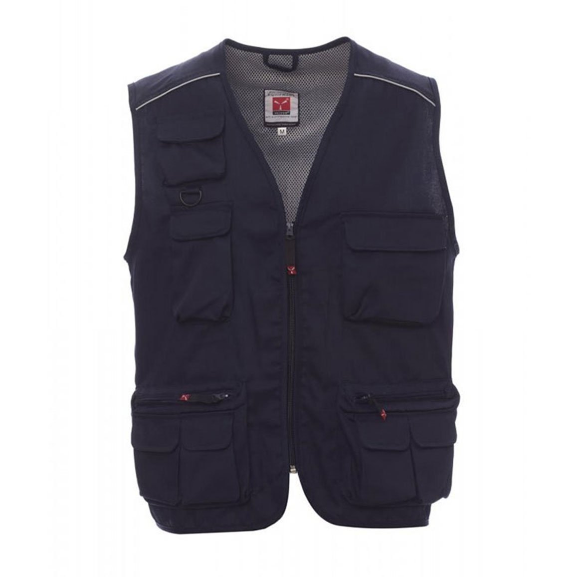 Summer vest, zip fastening, multi-front pocket system with reversible badge holder, reflex piping on the shoulders and back, roomy back hunting pocket. Contrasting colour dry-tech lining, open for easier printing and embroidery.