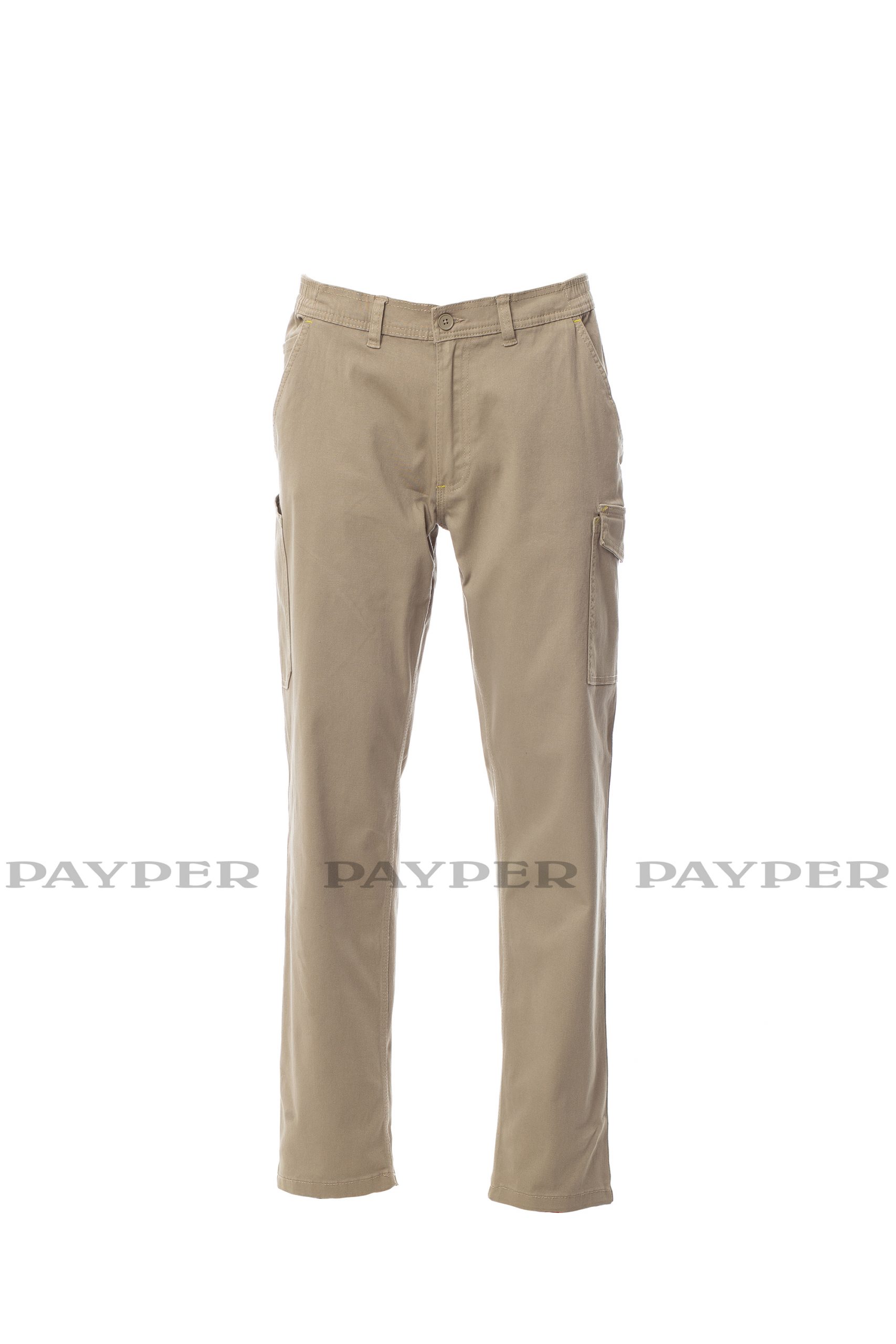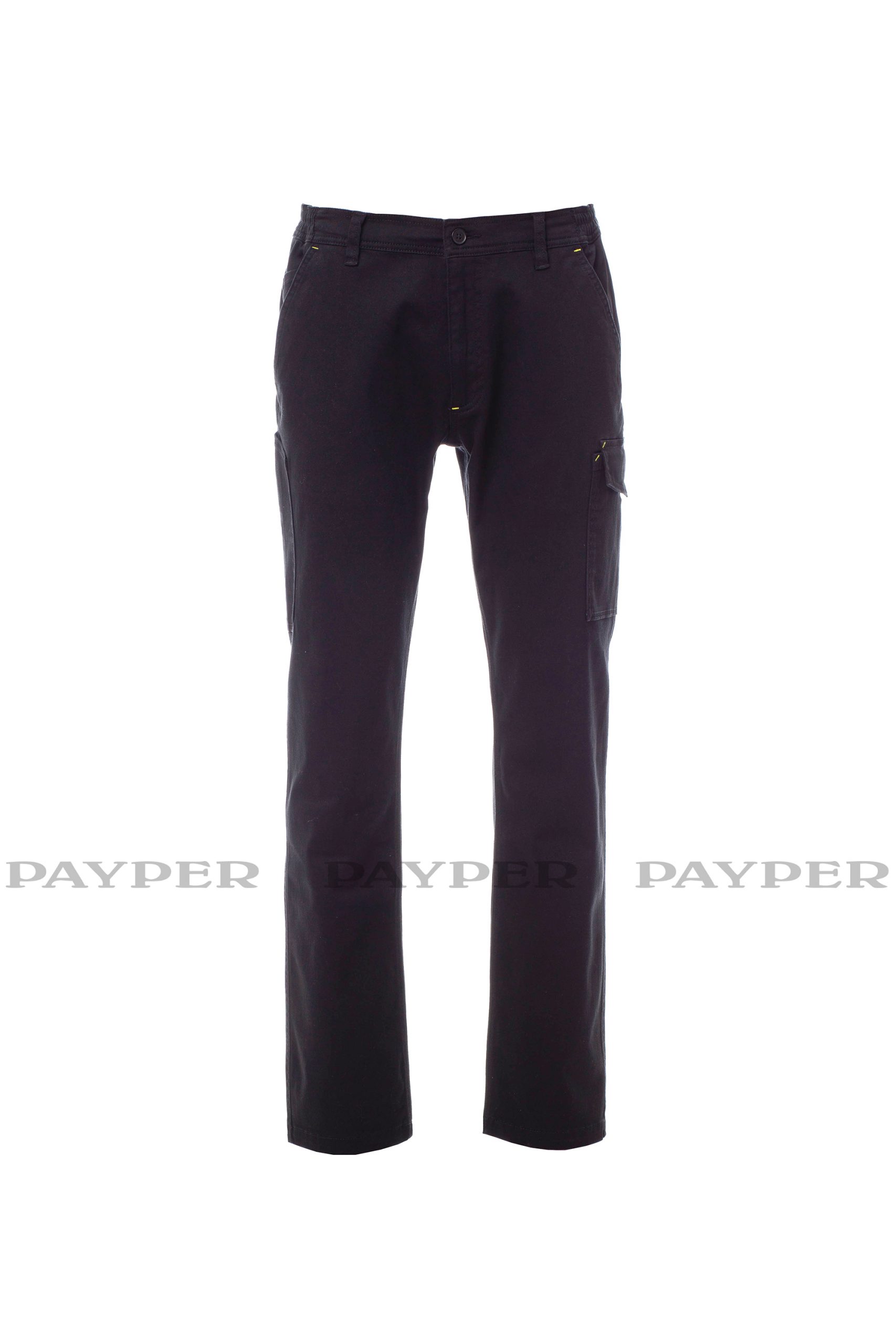Trousers with belt loops and elastic waist, zip and button closure. Triple-stitched reinforced seams on the crotch and inside leg, double-stitched side seams, two classic front pockets, coin pocket, right side tape measure pocket, left side pocket with LOCK SYSTEM flap closure, two back pockets, one with flap and Velcro.