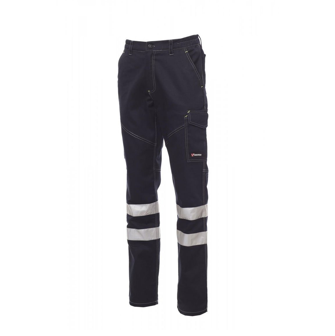 All-season unisex trousers with cat. 1 reflective stripes, side elastic and waist belt loops, zip fastening with plastic button, two classic front pockets, one side pocket with LOCK SYSTEM, one tape measure pocket, two back pockets, one with flap and one open with Velcro flap, contrasting inserts and stitching, reflective stripes on the back pocket, triple stitched seams.