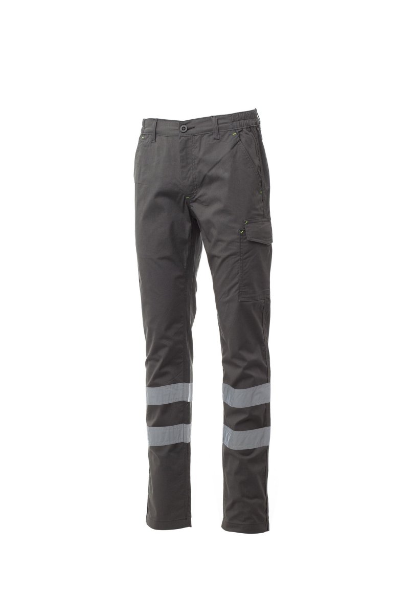Stretch twill cotton trousers with cat. 1 retroreflective stripes, with belt loops and elastic waistband, zip and button closure. Two French cut front pockets, coin pocket, right side tape measure holder, left side pocket with LOCK SYSTEM flap closure, two back pockets, one with flap and Velcro. Triple-stitched seams.